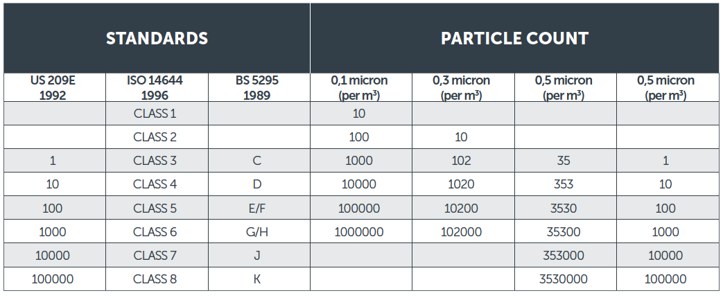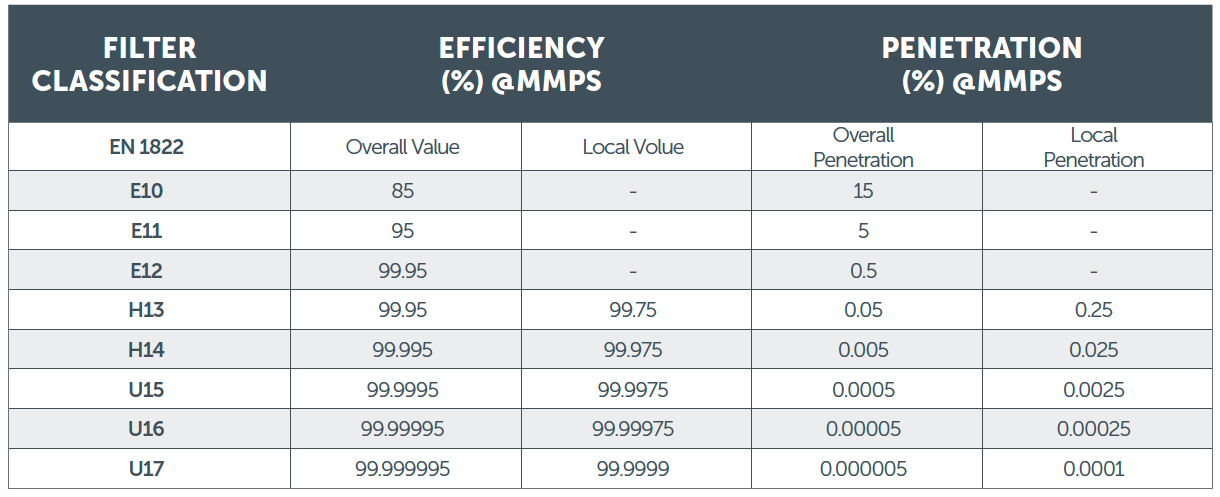 Their classification is based on the measuring of the size of particles (MPPS) passing to the clean side at a specific air speed.